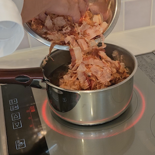 ②沸騰したら弱火にし、削り節を30〜40gいれる。