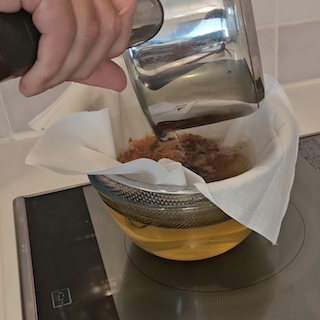 ③火を止め、ザルにキッチンペーパー等をのせて濾す。